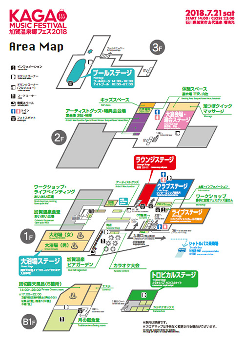 Based on the theme of the fusion between music and onsen, this event will feature over 40 different artists and groups including bands, DJs and pop idols, performing on 6 different stages within the grounds, such as the night club, auditorium, banquet hall, etc.